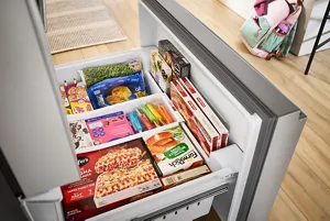 36-Inch French Door Refrigerator with Ice Maker - 31 cu. ft.Get Family-Sized capacity with the Whirlpool® 31 cu. ft. French door refrigerator. Large Capacity Ice Production makes over 3 lbs of ice every day. Pint Size storage provides easy access to small items. And flexible storage with half and full Adjustable Glass Shelves.