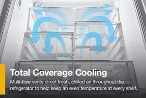 With Total Coverage Cooling, multi-flow vents direct fresh, chilled air throughout the refrigerator to help keep an even temperature at every shelf.