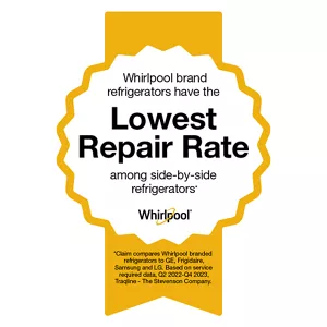 Whirlpool brand refrigerators have the lowest repair rate among side by side refrigerators**Claim compares Whirlpool branded refrigerators to GE, Frigidaire, Samsung and LG. Based on service required data, Q2 2022-Q2 2023, Traqline - The Stevenson Company, 2023.